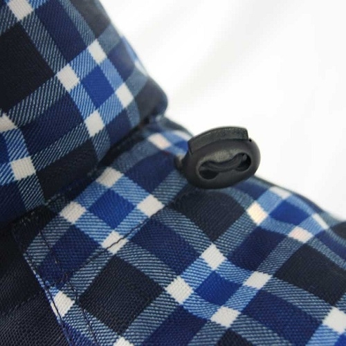 – El cuello tiene un botón y un velcro para poder introducir la cabeza más fácilmente, además de un cinta elástica con tope para ajustárselo una vez puesto.