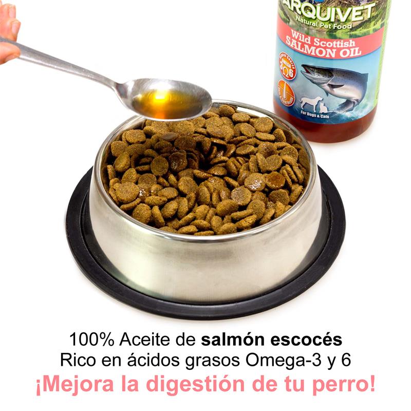 Los ácidos grasos omega-3 mantienen la presión arterial y el colesterol bajos. Los ácidos grasos omega-6 inhiben las respuestas inflamatorias y mantienen la resistencia de su mascota. Además, el aceite de salmón mejora la digestión.