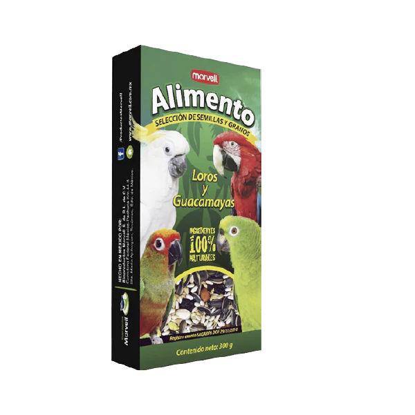 Descripción: Pellets, semillas y frutas.