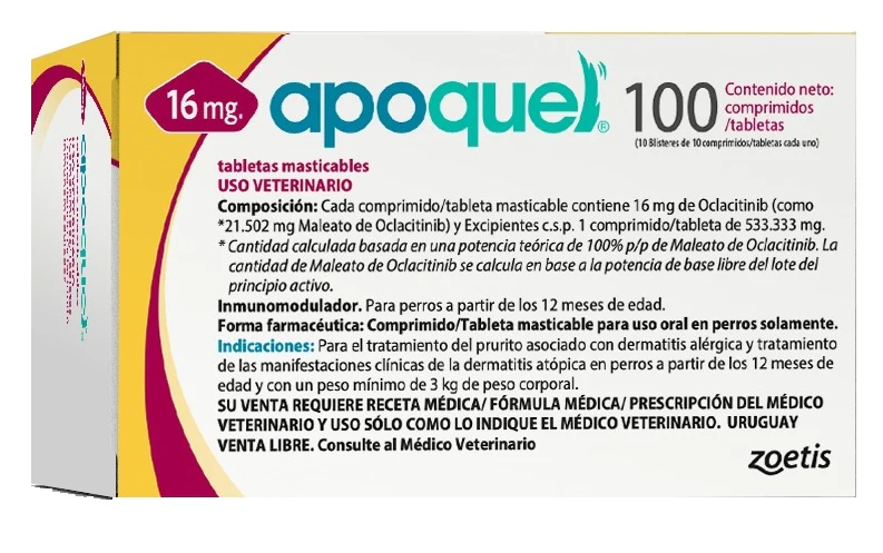 Apoquel® 16 mg: Cada tableta recubierta con película contiene 16 mg de Oclacitinib (como Maleato de Oclacitinib).