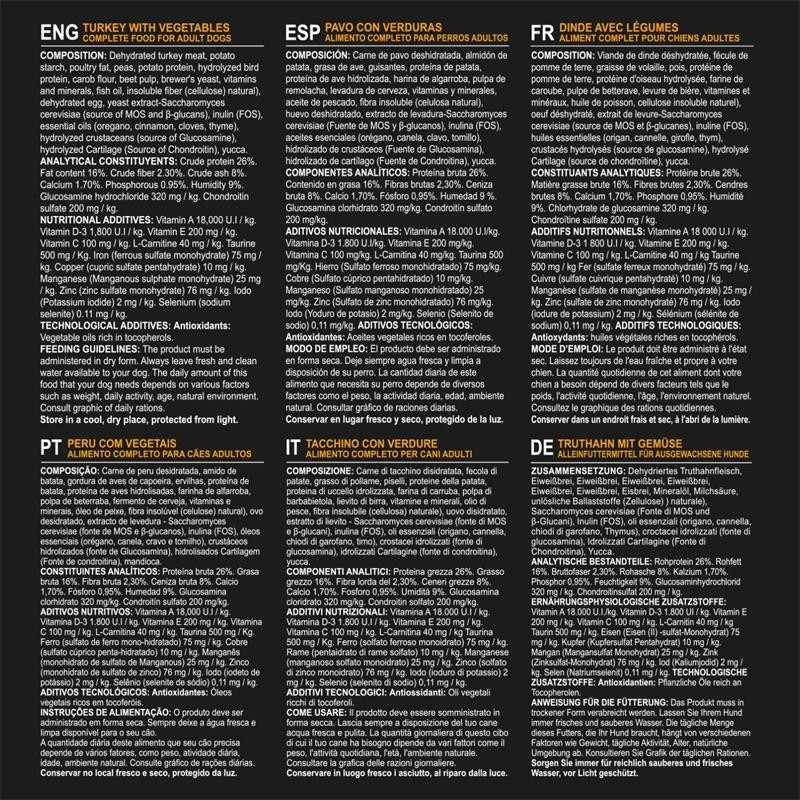 COMPOSICIÓN: Carne de pavo deshidratada, almidón de patata, grasa de ave, guisantes, proteína de patata, proteína de ave hidrolizada, harina de algarroba, pulpa de remolacha, levadura de cerveza, vitaminas y minerales, aceite de pescado, fibra insoluble (celulosa natural), huevo deshidratado, extracto de levadura-Saccharomyces cerevisiae (Fuente de MOS y Beta-glucanos), inulina (FOS), aceites esenciales (orégano, canela, clavo, tomillo), hidrolizado de crustáceos (Fuente de Glucosamina), hidrolizado de cartílago (Fuente de Condroitina), yucca.