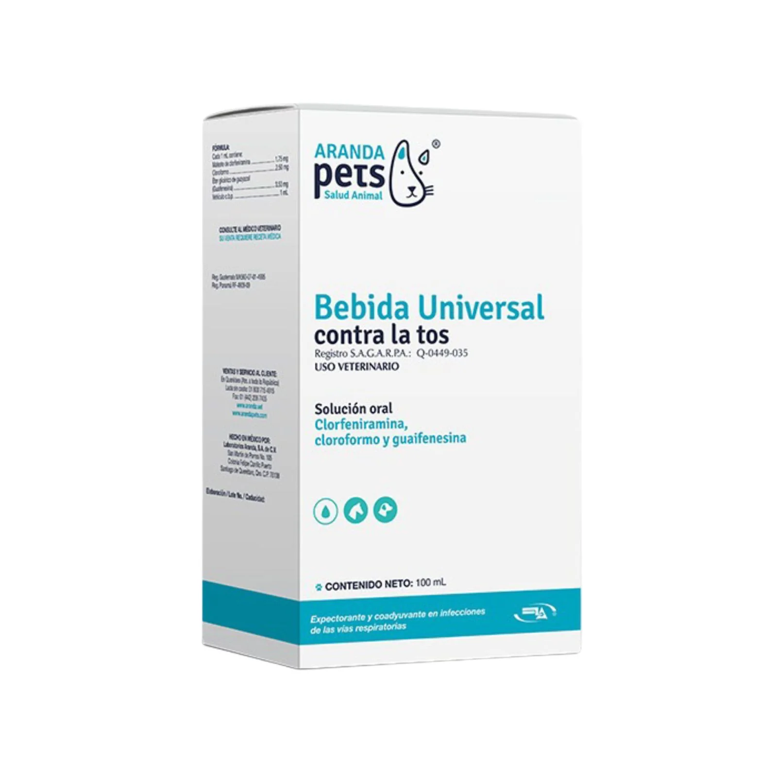 Es un producto de amplia acción para controlar los ataques de tos en bovinos, equinos, porcinos, ovinos, caprinos y caninos. Ejerce una acción expectorante con lo que evita la acumulación de moco en las vías respiratorias superiores. Coadyuvante en el tratamiento de bronquitis, neumonía, influenza y todo tipo de trastornos del aparato respiratorio.