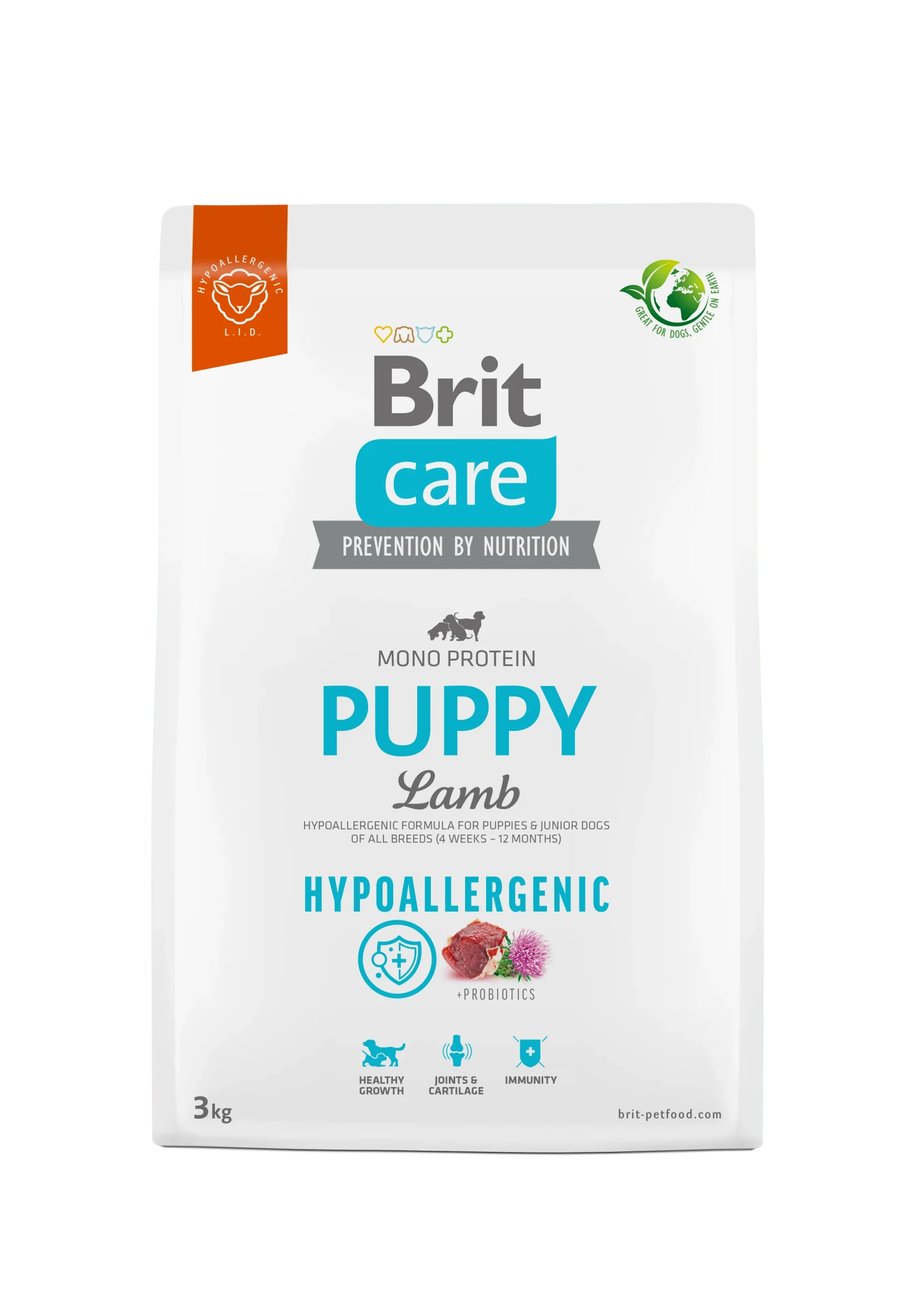 Brit Care Puppy Lamb Hypoallergenic es un alimento hipoalergénico para cachorros de todas las razas (desde 4 semanas a 12 meses). Formulado con un alto contenido de proteínas, grasas y nutrientes esenciales para ayudar al correcto desarrollo. Los prebióticos con inulina ayudan al sistema inmunológico y la flora intestinal. Con condoprotectores para cuidar las articulaciones. Altos niveles de Omega 3.