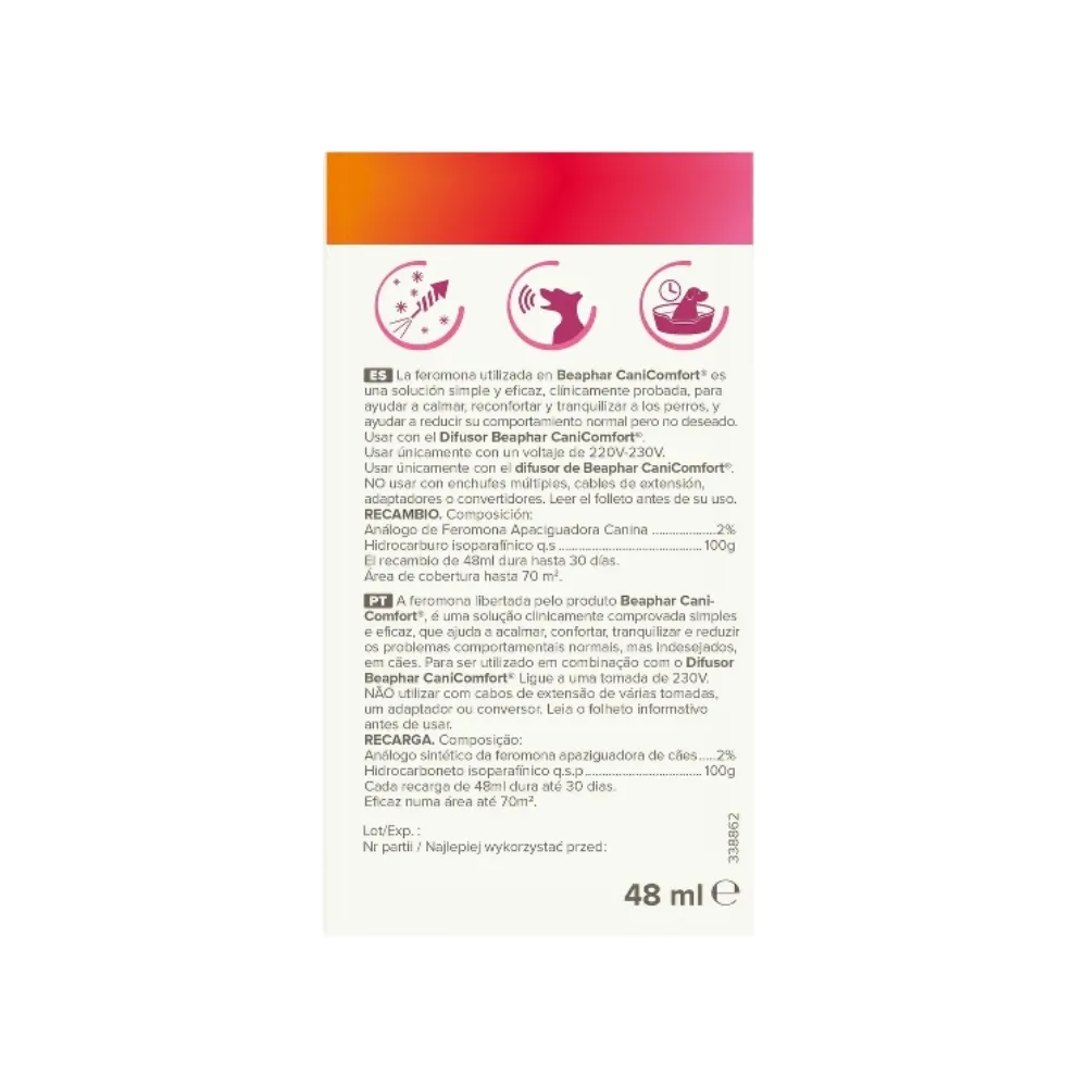CaniComfort Refill 48 ml Beaphar es un repuesto para difusor eléctrico que utiliza feromonas sintéticas apaciguadoras caninas (DAP) para ayudar a reducir el estrés y la ansiedad en perros. Favorece la adaptación a cambios en el entorno y contribuye a disminuir comportamientos no deseados relacionados con la tensión.