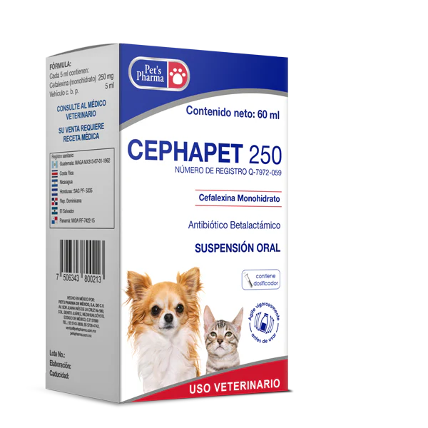 INDICACIONES: Es una cefalosporina de primera generación de amplio espectro indicada para el tratamiento de infecciones cutáneas especialmente producidas por bacterias gran positivas como el S. Intermedius y para infecciones urinarias de las vías bajas. Asi como por infecciones causadas por los siguientes microorganismos: Corynebacterium pyogenes, Staphylococcus aureus, Streptococcus spp., E. coli, Enterobacter aerogenes y Pasteurella spp. En piodermas profundos se recomiendas protocolos de hasta 3 meses a criterio del Médico Veterinario. |