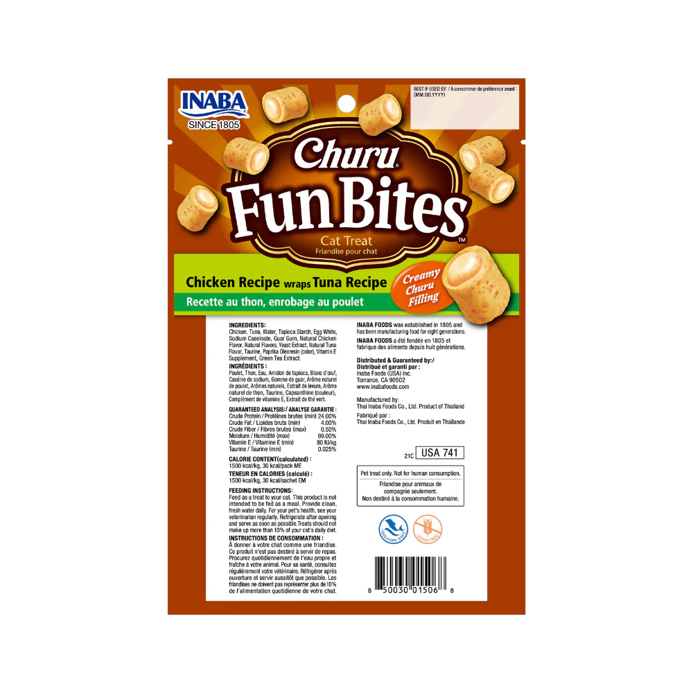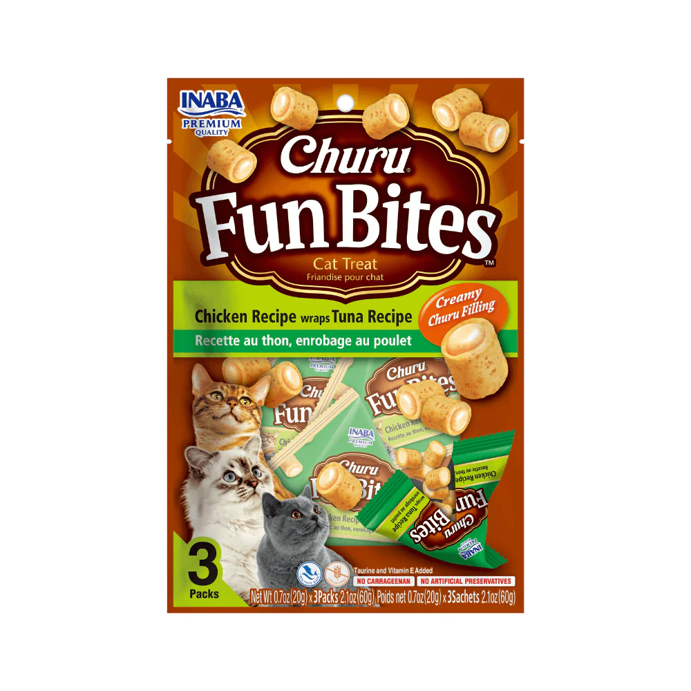Churu Fun Bites Atún y Pollo es un novedoso y delicioso snack para gatos de textura crujiente y cremosa (puré), de alta palatabilidad. Tiene un alto contenido de humedad lo que encanta a los gatos y además contribuye a su hidratación
