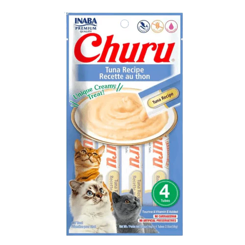 Churu Gato Atún (paquete conteniendo 4 tubitos), es un novedoso y delicioso snack* para gatos de textura cremosa (puré) y alta palatabilidad. Tiene un alto contenido de humedad lo que encanta a los gatos y además contribuye a su hidratación