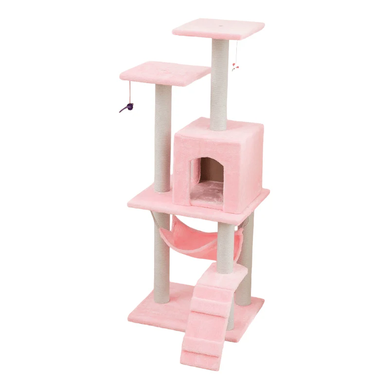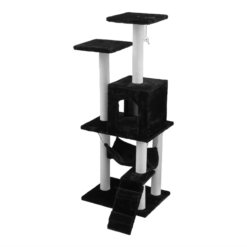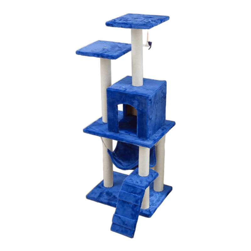 En su base, esta estructura se asienta sobre una robusta plataforma con múltiples niveles de plataformas de salto y descanso. Estas plataformas son revestidas con suave felpa que brinda a tus gatos un lugar cómodo para descansar, observar su entorno y planear sus próximas acrobacias.