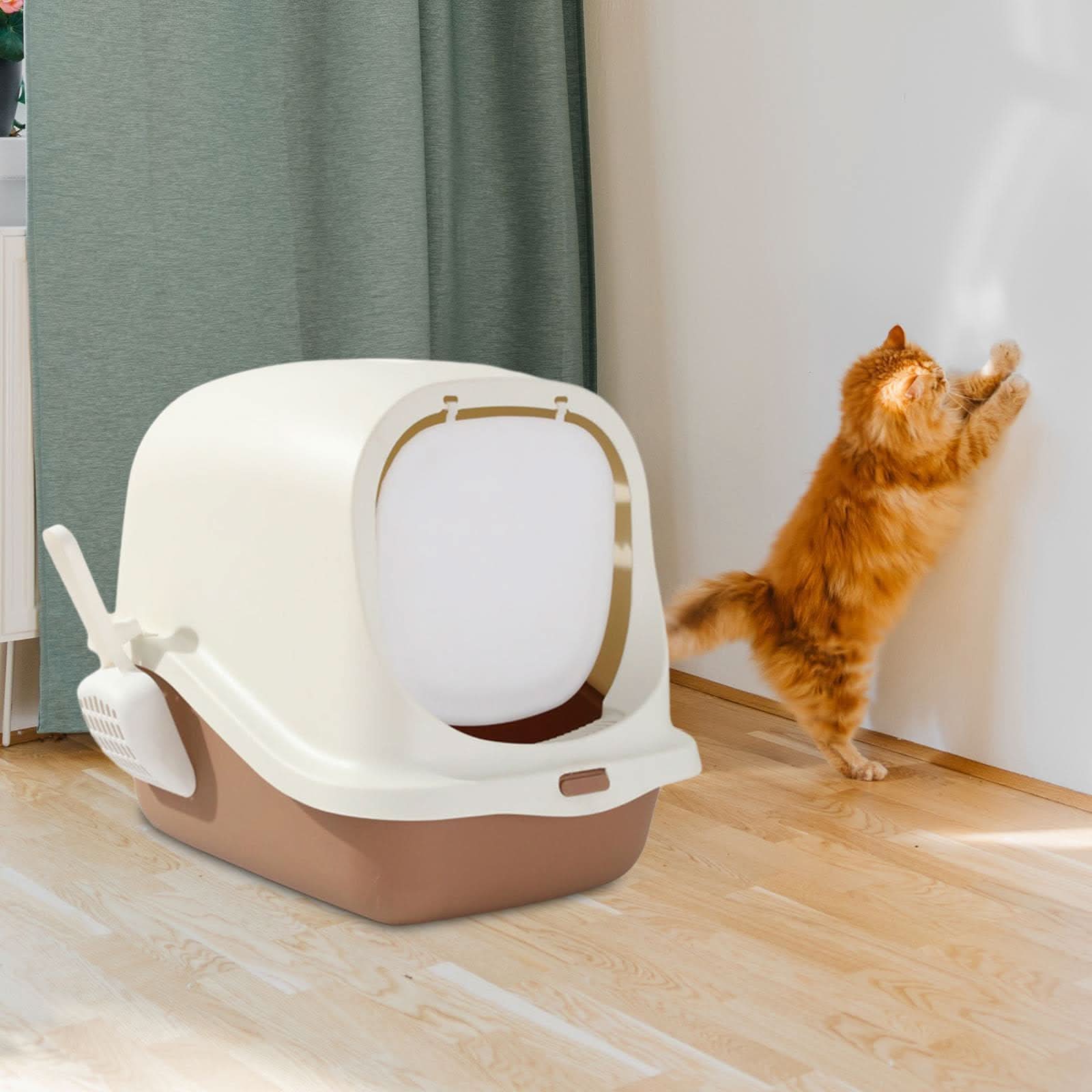 Este práctico arenero cubierto para gatos mantiene la higiene de tu hogar, ofreciendo privacidad a tu mascota y evitando la dispersión de arena. Su diseño con puerta abatible facilita el acceso y la limpieza, mientras que la pala incluida permite retirar los desechos de manera rápida y sencilla. ¡Una solución cómoda y discreta para ti y tu felino!