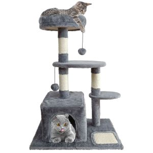 En su base, esta estructura se asienta sobre una robusta plataforma con múltiples niveles de plataformas de salto y descanso. Estas plataformas son revestidas con suave felpa que brinda a tus gatos un lugar cómodo para descansar, observar su entorno y planear sus próximas acrobacias.
