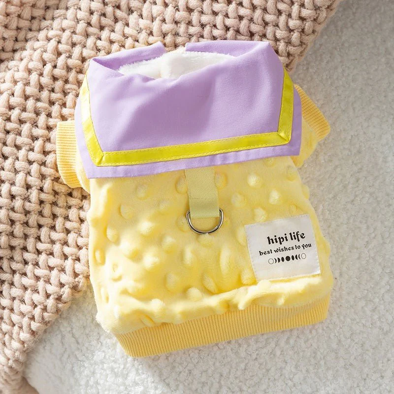 Haz que tu mascota luzca adorable y con estilo gracias a este suéter acolchado en tono amarillo pastel, diseñado con un encantador cuello lila con ribete decorativo. Ideal tanto para perros como para gatos, brindando comodidad y un look único.