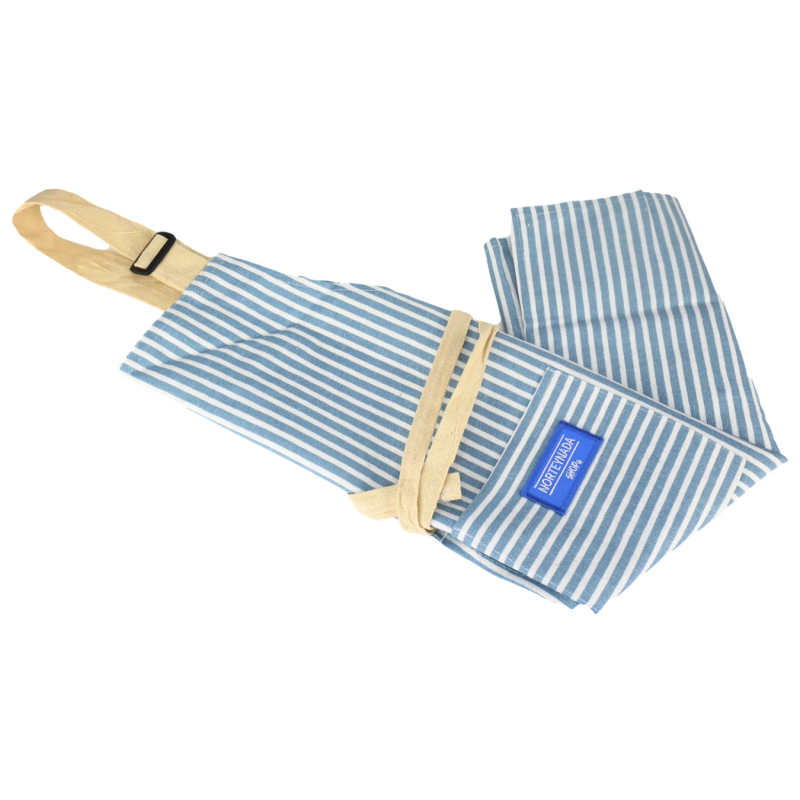 Precioso delantal de baño NORTEYNADA estampado con rayas en color azul y crema. Impermeable y tratamiento anti-pelos. Es ajustable en cuello y cintura, con un bonito bolsillo doble en el centro.