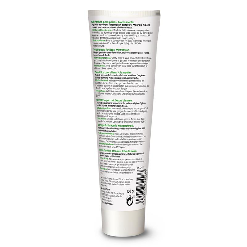 Instrucciones de uso: introducir delicadamente una pequeña cantidad de dentífrico en los dientes y las encias de su perro para que se acostumbre con el sabor y la sensación que provoca. El uso del dentífrico no representa ningún peligro.
