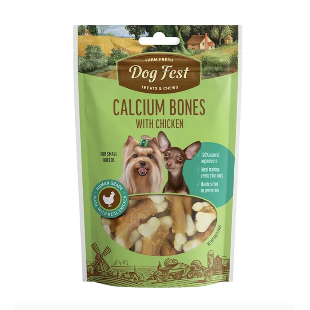 Dog Fest Huesitos de Calcio con Pollo 55 gr es la elección perfecta para consentir a tu perro con un snack nutritivo y delicioso. Estos huesitos están hechos a mano con calcio y carne fresca de pollo, proporcionando un sabor irresistible que tu mascota adorará. Elaborados con ingredientes 100% naturales y de grado humano, estos snacks no contienen preservantes, colorantes ni saborizantes artificiales, asegurando que tu perro reciba solo lo mejor.