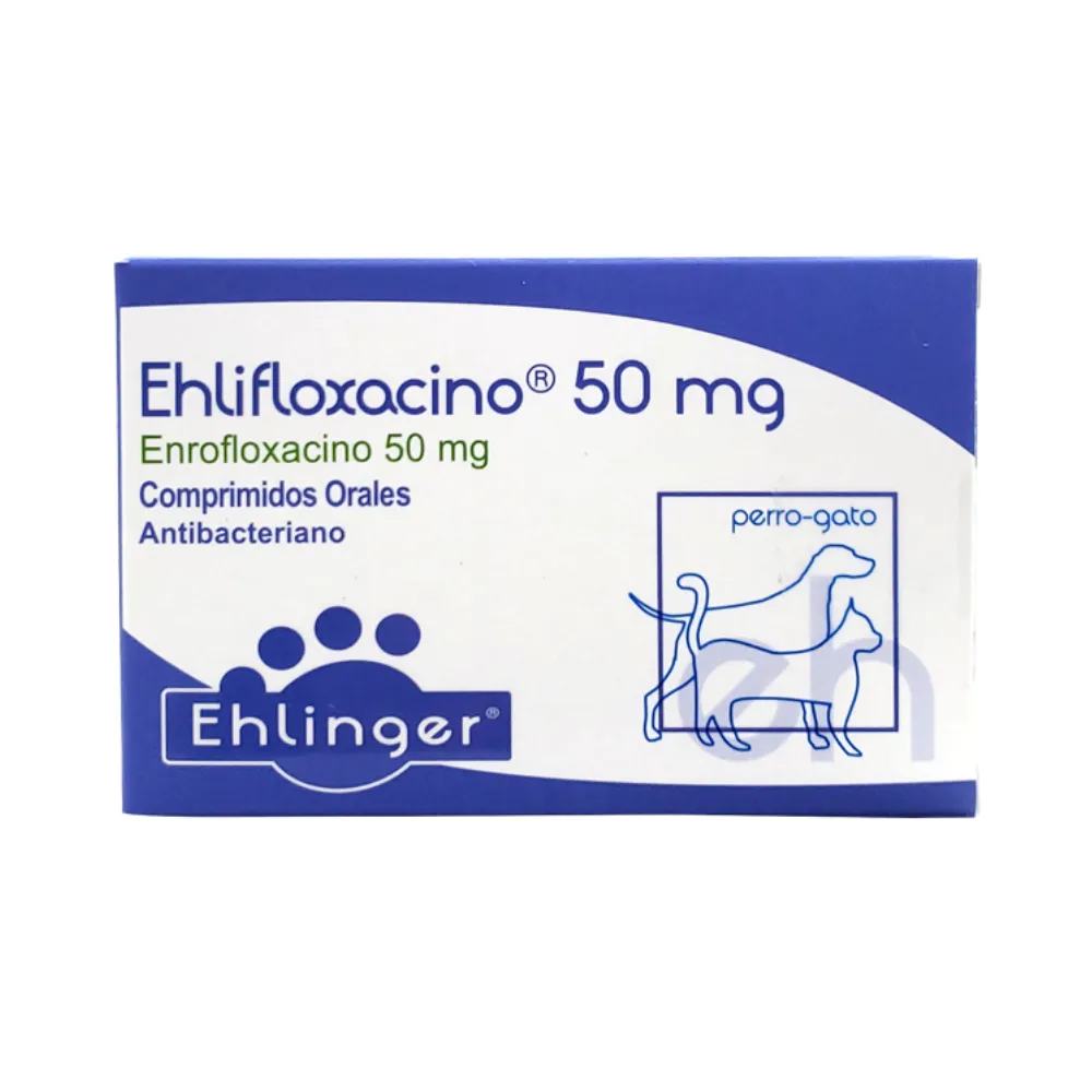 5 mg de Enrofloxacino/kg de peso corporal/24 horas equivalente a 1 comprimido de Ehlifloxacino® 50 mg/10 kg de peso corporal/24 horas, o 2,5 mg de Enrofloxacino/kg de peso corporal/12 horas equivalente a ½ comprimido de Ehlifloxacino® 50 mg/10 kg de peso corporal/12 horas, durante 5 a 14 días. En infecciones complicadas o crónicas, susceptibles a Enrofloxacino, el tratamiento puede extenderse por varias semanas.