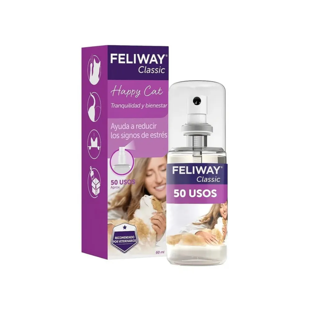 Evita esos comportamientos indeseados que hace tu gato. Presentación en spray de 60 ml. Feliway consiste en una copia sintética de la «feromona facial felina», que es la que los gatos utilizan para marcar su territorio como una zona segura. Al imitar la feromona, Feliway crea un estado de seguridad y tranquilidad en el entorno que rodea a tu gato, haciendo que le resulte familiar y más cómodo. Por este motivo, Feliway puede utilizarse para ayudar a que tu gatito se sienta seguro y que el entorno le resulte confortable, durante situaciones que pueden ser para él una fuente de estrés. Feliway se utilizar para: Detener el marcaje urinario que hace tu gato, aplicándolo justo en esos lugares que más le gustan!. Para tranquilizar a tu gatito en ambientes desconocidos o que generan altos niveles de estrés, como el auto, cambio de casa, veterinario, etc. Finalmente ayuda a prevenir o disminuir el estrés que le puede producir al gato un cambio en su entorno y así evitar conductas indeseadas de nuestros gatitos.