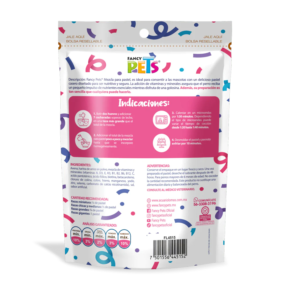 Mezcla de pastel es mas que un simple postre. Está formulada con ingredientes de alta calidad como avena y harina de postre de arroz en polvo, y fortificada con una mezcla de vitaminas y minerales esenciales para la salud de tu mascota. A diferentes de los pasteles humanos, este es bajo en grasas y azúcares, garantizando un capricho tan saludable como delicioso. Solo necesites añadir unos pocos ingredientes, mezclar y hornear para crear un pastel casero perfecto. Es una manera sencilla y divertida de mostrarle a tu perro cuanto lo quieres, sin sacrificar su bienestar.