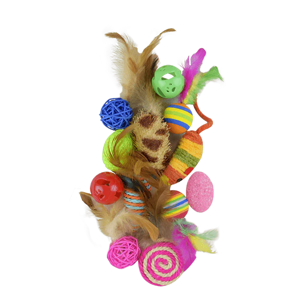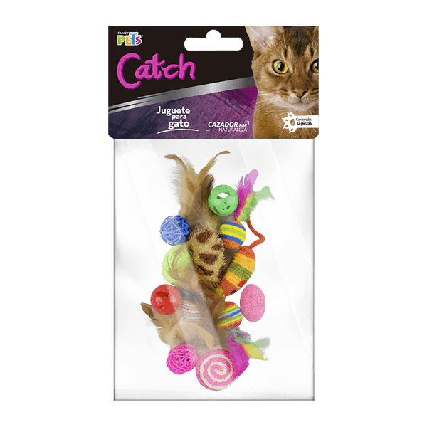 El set surtido de juguetes está diseñado para saciar el instinto cazador de tu gato, que como depredador se encuentra siempre al acecho. Ayudará a disminuir el aburrimiento, a mejorar su comportamiento y a fortalecer el vínculo con su dueño. Todos los juguetes son elaborados con materiales resistentes y con colores y formas llamativos.