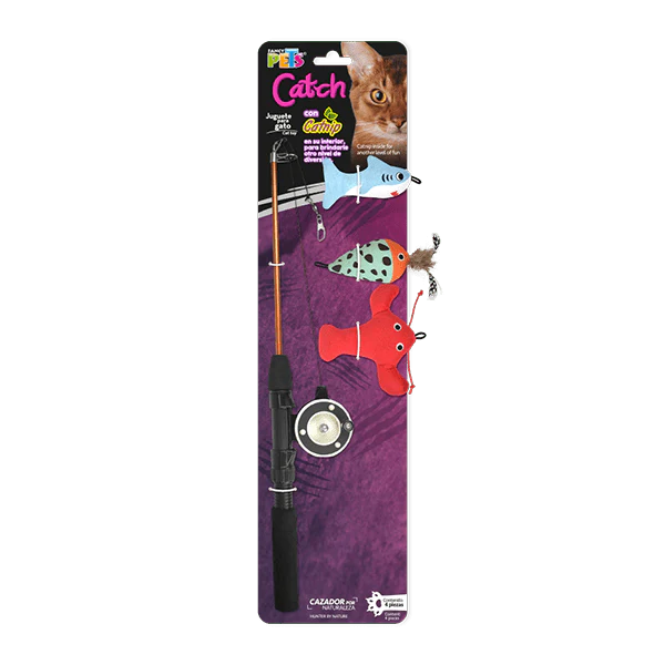 Juguete interactivo que incluye una caña de pescar resistente y flexible con tres peluches en forma de langosta, tiburón y pez con plumas. Cada uno intercambiable para ofrecer variedad y mantener el interés de tu felino. Los peluches están rellenos con catnip de alta calidad, asegurando horas de juego estimulante y placentero para tu gato.