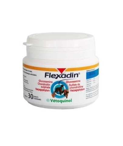 Por su fórmula original con condroitin, glucosamina y Harpagophytum procumbens (conocido por sus propiedades calmantes a nivel articular), FLEXADIN® aporta los nutrimentos esenciales para el cartílago y contribuye a mantener su integridad, indispensable para una movilidad adecuada, particularmente en la mascota de edad avanzada.