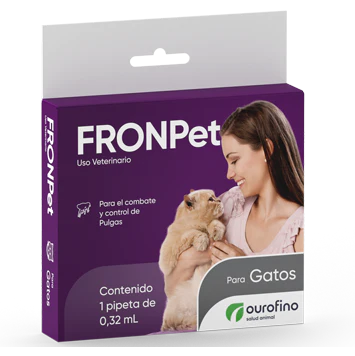 FRONPet es un producto de uso tópico indicado para el combate y control de infestaciones causadas por el ectoparásito Ctenocephalides felis felis (pulgas) en perros y gatos y Rhipicephalus sanguineus (garrapata) en perros.