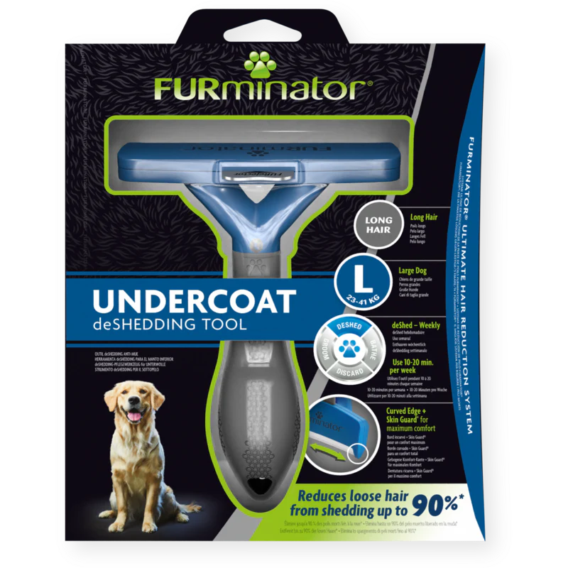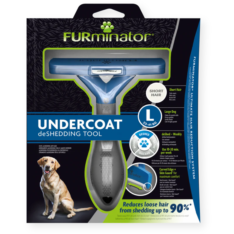El cepillo FURminator® Undercoat deShedding para perros grandes reduce la cantidad procedente de la muda hasta en un 90 %. El borde de eliminación del pelo de acero inoxidable atraviesa la capa externa para eliminar de forma segura y sencilla el pelo suelto, muerto y la capa inferior. Elimina el pelo sin dañar la capa superior ni cortar la piel si se utiliza siguiendo las instrucciones. El Skin Guard® especial se desliza sobre la piel de su perro y mejora la penetrabilidad de los bordes. Además, el borde curvado se ajusta a la forma natural de la mascota y está pensado para el máximo confort. El botón FURejector® libera el pelo, facilitando su proceso de eliminación. El protector del borde ayuda a conservar los dientes cuando se guarda la herramienta. Gracias al mango ergonómico del FURminator® Undercoat deShedder, cepillar es cómodo. FURminator® Undercoat deShedding elimina mucho más pelo procedente de la muda que un cepillo o peine normal. Para obtener los mejores resultados, utilícelo semanalmente durante 10 o 20 minutos e incluso con más frecuencia durante la época de muda. FURminator® proporciona confianza en el cepillado con las herramientas ideales para un cepillado profesional en casa.