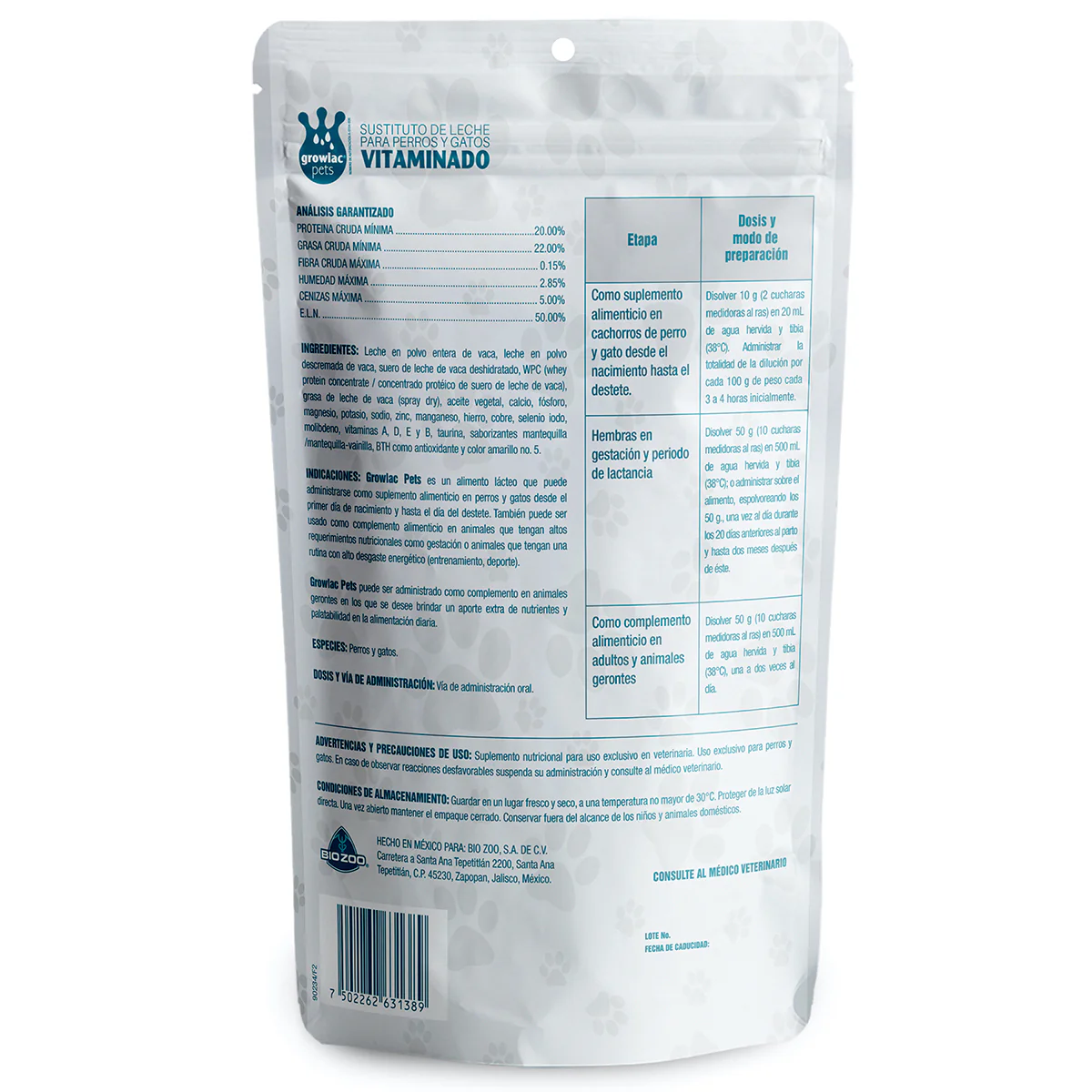 Growlac Pets es un alimento lácteo que puede administrarse como suplemento alimenticio en perros y gatos desde el primer día de nacimiento y hasta el día del destete. También puede ser usado como complemento alimenticio en animales que tengan altos requerimientos nutricionales como gestación o animales con una rutina de alto desgaste energético (entrenamiento, deporte). Puede ser administrado como complemento en animales gerentes en los que se desee brindar un aporte extra de nutrientes y palatabilidad en la alimentación diaria.