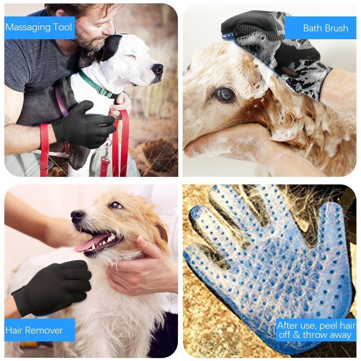 El guante es muy útil e ideal para la estética y el cuidado de sus mascotas es funcional para perros, gatos y todas las mascotas con pelos. cuenta con 180 puntas de silicona suave logras quitar el exceso de pelo mientras le haces un masaje relajante a tu mascota. También cuenta con una tela anti-manchas al otro lado del guante para que no te preocupes de la suciedad del guante aparte de todo es limpia fácil para que no pierdas el tiempo limpiando el guante.
