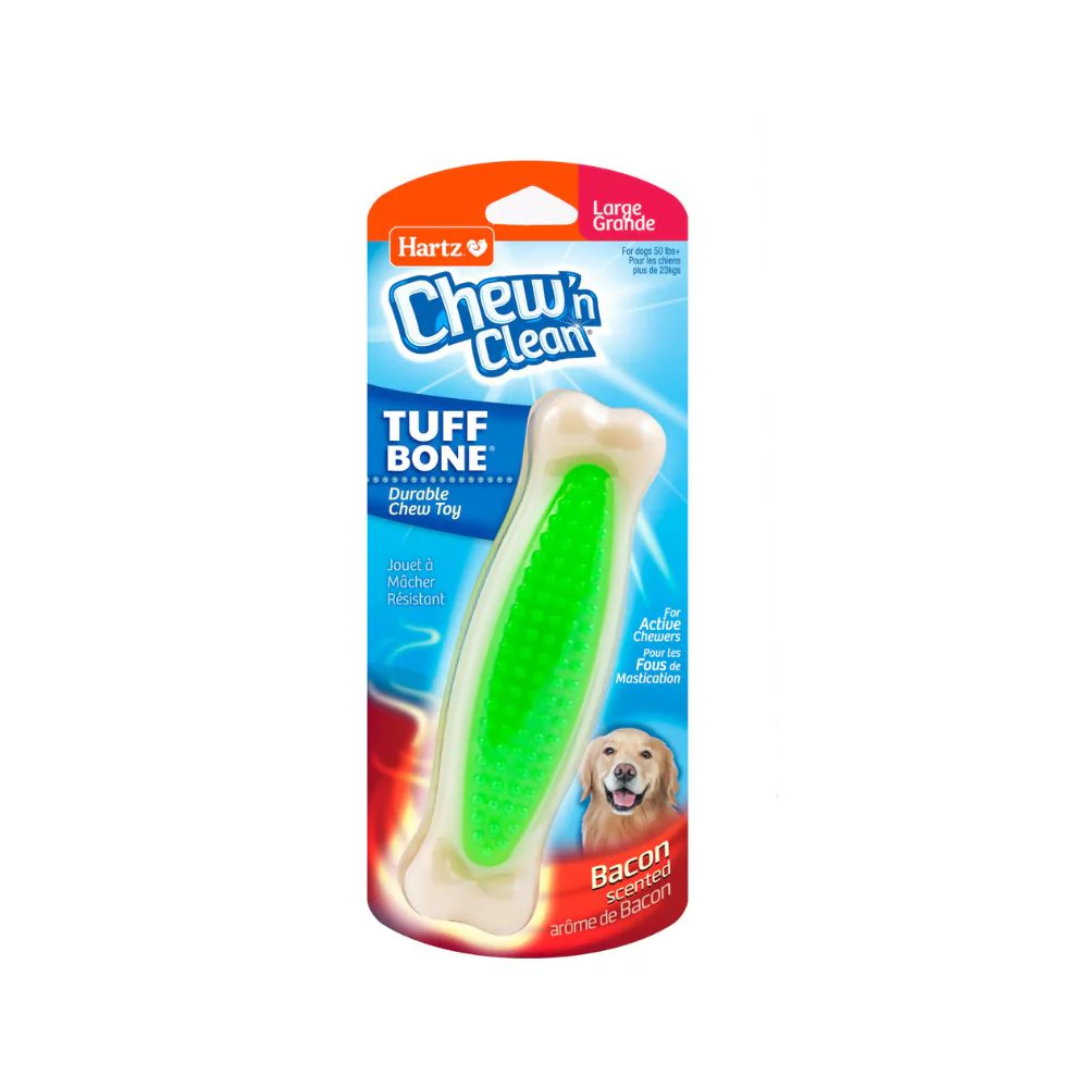 Su perro está programado para masticar, masticar y masticar. Fomentar este comportamiento instintivo proporcionándole a su compañero canino un artículo para masticar adecuado puede promover el bienestar mental y emocional, además de beneficios dentales. El hueso masticable Hartz Chew ‘n Clean Tuff Bone es un juguete para masticar duradero fabricado con materiales resistentes que soportan una masticación de leve a moderada.