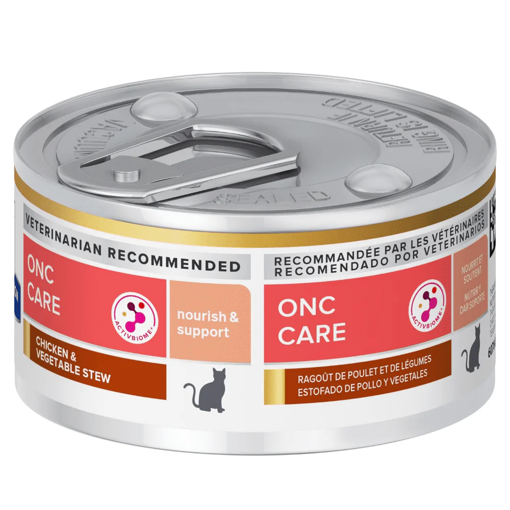 Cuando los gatos tienen cáncer, es fundamental asegurarse de que se satisfagan sus necesidades nutricionales. Los alimentos terapéuticos para gatos con cáncer están diseñados para ayudar a mantener la fuerza y la energía, así como para alentarlos a comer desde el primer plato. Los nutricionistas y veterinarios de Hill’s desarrollaron la nutrición clínica de Hill’s Prescription Diet ONC Care para ayudar específicamente a nutrir y apoyar a los gatos que luchan contra el cáncer. Esta comida húmeda irresistible con pollo y verduras está diseñada para ser nuestra nutrición con mejor sabor hasta el momento, con grasas sabrosas y proteínas altamente digeribles. Los nutrientes altamente digeribles en Prescription Diet ONC Care son fáciles de absorber para las mascotas y la fórmula también contiene ActivBiome+, una mezcla patentada de fibras prebióticas para respaldar un microbioma gastrointestinal saludable y que ha demostrado proporcionar una calidad de heces constante.