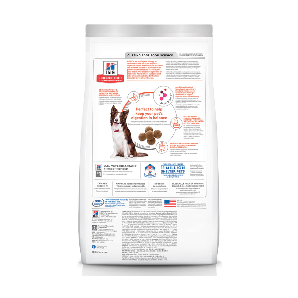 Las croquetas para perro adulto Hill’s Science Diet Perfect Digestion, alimento de cuidado digestivo, está diseñado para nutrir y mantener el bienestar de tu mascota. Estas croquetas para perro están enriquecidas con nuestra innovadora mezcla de prebióticos, ActivBiome+, que alimenta el microbioma intestinal y es esencial para una salud óptima. Gracias a la ciencia, este alimento promueve una digestión saludable y un bienestar general, formulado con proteína de alta calidad, vitaminas y minerales. Hill’s Science Diet es la marca de alimento para perro más recomendada por veterinarios en EUA, con 100% de satisfacción garantizada o te devolvemos tu dinero.