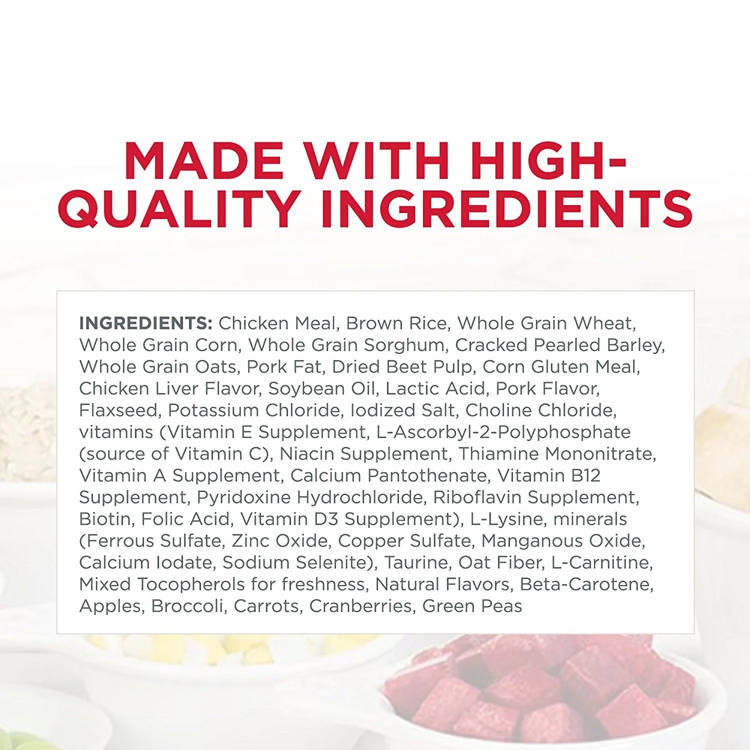 Harina de pollo, cebada perlada quebrada, arroz de cervecería, trigo entero, maíz entero, sorgo entero, avena entera, grasa de pollo, pulpa de remolacha desecada, harina de soya, saborizante de hígado de pollo, aceite de soya, ácido láctico, linaza, cloruro de potasio, carbonato de calcio, sal yodada, cloruro de colina, vitaminas (complemento de vitamina E, L-ascorbil-2-polifosfato (fuente de vitamina C), complemento de niacina, mononitrato de tiamina, complemento de vitamina A, pantotenato de calcio, complemento de riboflavina, biotina, complemento de vitamina B12, clorhidrato de piridoxina, ácido fólico, complemento de vitamina D3), L-lisina, minerales (sulfato ferroso, óxido de zinc, sulfato de cobre, óxido manganoso, yodato de calcio, selenito de sodio), taurina, DL-metionina, fibra de avena, tocoferoles mixtos para la frescura, sabores naturales, L-carnitina, beta caroteno, manzanas, brócoli, zanahorias, arándanos, guisantes verdes.