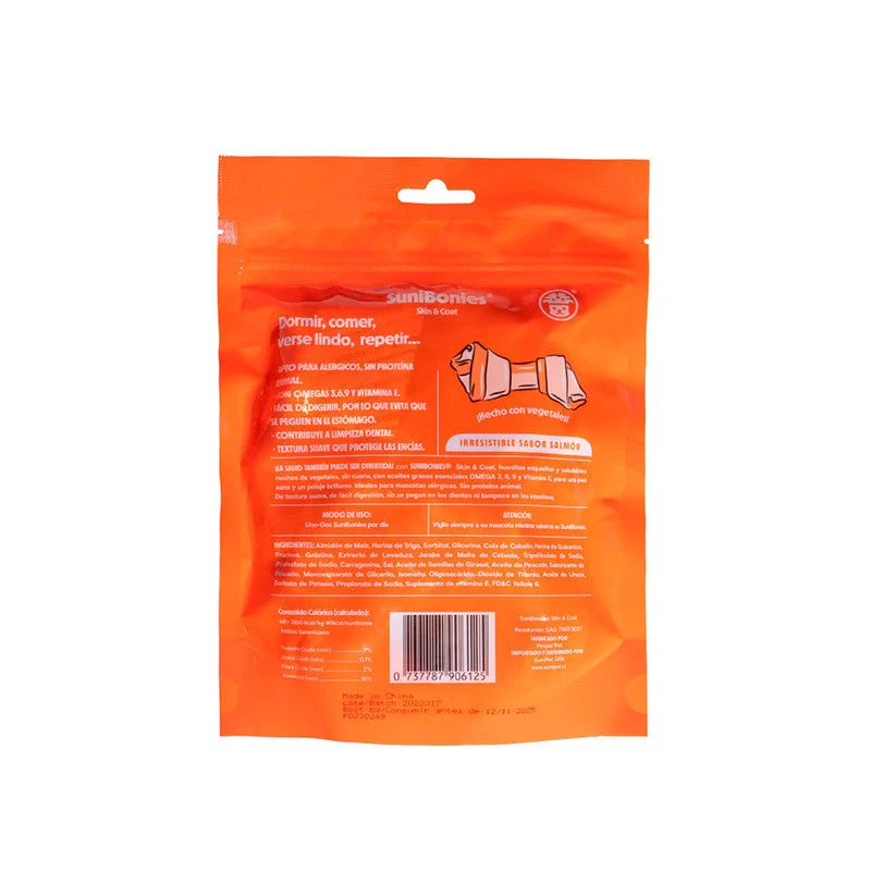 SuniBonies®, huesitos exquisitos y saludables hechos de vegetales, SIN CUERO, con aceites grasos esenciales OMEGA 3 y 6 y Vitamina E, potencian una piel sana y un pelaje suave y brillante.