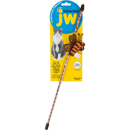 El Juguete Varita con Mariposa para Gatos Petmate es un juguete interactivo para gatos que consiste en una varita de plástico con una mariposa de tela en el extremo. La mariposa se mueve de manera impredecible, lo que atrae la atención de los gatos y los incita a jugar y cazar.