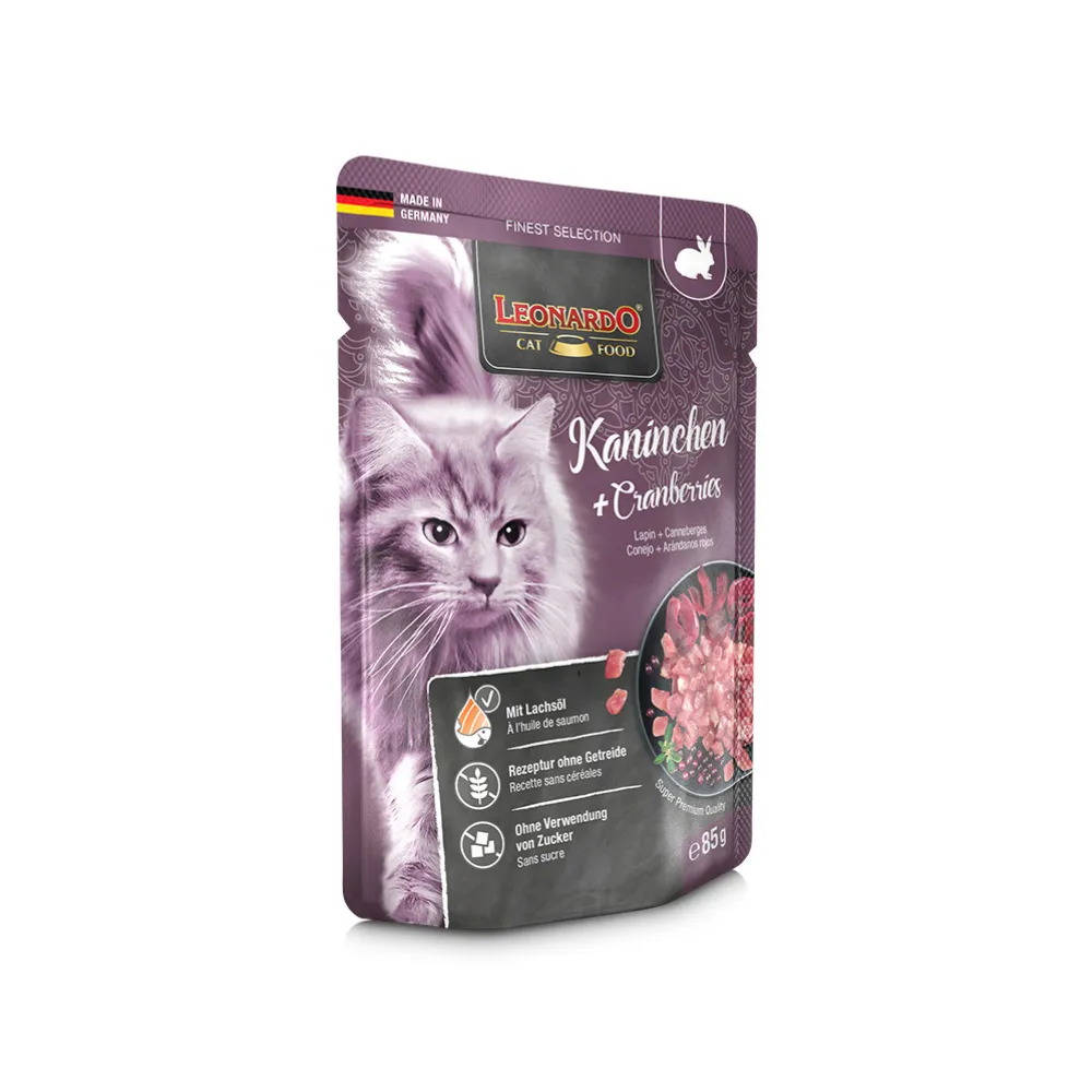 Esta combinación de carne de conejo aromático y arándanos rojos, el superalimento con muchos ingredientes valiosos, es realmente sabrosa. Y también es buena para el pelaje: ¡Leonardo Conejo + Arándanos hace brillar el pelaje gracias a los ácidos grasos poliinsaturados del aceite de salmón!