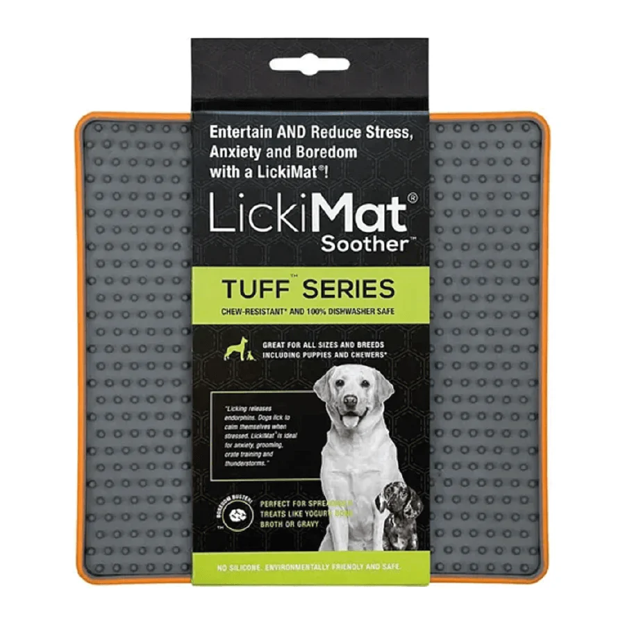 LickiMat Soother Tuff es una alfombrilla de silicona que estimula el lamido, un comportamiento que provoca la segregación de hormonas calmantes en tu perro. Hace que las comidas pequeñas duren más tiempo, lo que lo convierte en un complemento perfecto para perros que necesitan perder peso o comer más lento. Ayuda a promover una boca sana, ya que lamer estimula la producción de saliva. ¡Incluso puedes congelar el LickiMat para que se convierta en algo refrescante en un día caluroso y hacer que el entretenimiento de tu perro dure más! LickiMat Shother: Diseño de puntos.