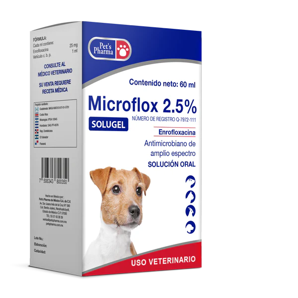 MICROFLOX 2.5%: Caninos y felinos: 5 mg/kg de peso, que equivale a 1 mL/5 kg cada 24 hrs., durante 3-5 días.