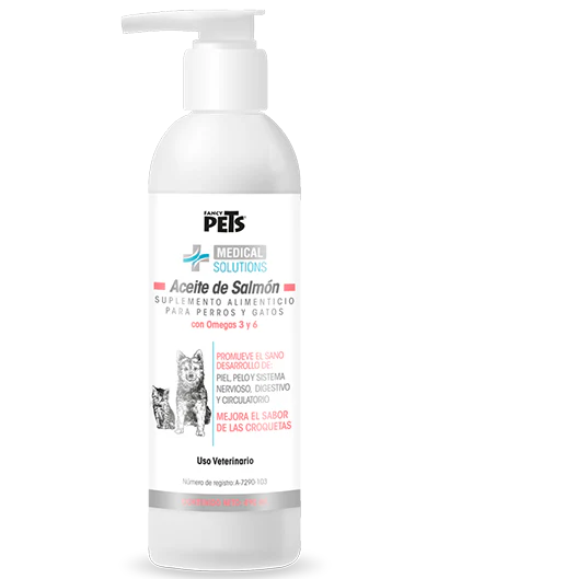 El aceite de Salmón es un suplemento alimenticio que contiene ácidos grasos como DHA y EPA. Éstos pueden proporcionar una serie de beneficios, incluyendo la mejora de piel y pelaje. Contribuyendo al sistema nervioso y fortalece el sistema inmune. Además de brindar un mejor sabor a las croquetas. Proteína cruda (mín) 1%, Grasa cruda (mín.) 98%, Fibra cruda (máx). 1%, Humedad (max) 5%.