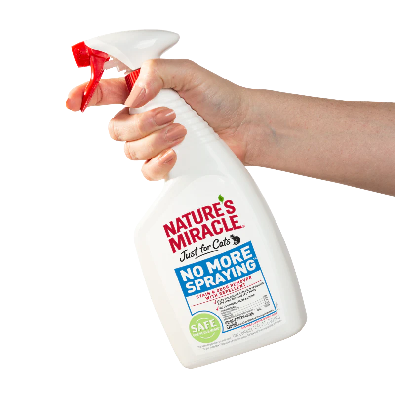 Nature’s Miracle® No More Spraying es un repelente natural que evita que los gatos vuelvan a visitar y rocíen el mismo lugar dos veces. Cuando se usa para limpiar un área previamente rociada por un gato, Nature’s Miracle® No More Spraying elimina las manchas y los olores existentes dejando un aroma a limoncillo y canela. Estos aromas repelen y evitan que los gatos regresen al área. Ideal para usar cuando se trata de romper los hábitos de pulverización de los gatos, No More Spraying repelerá a los gatos al mismo tiempo que elimina las manchas y los olores de la orina.