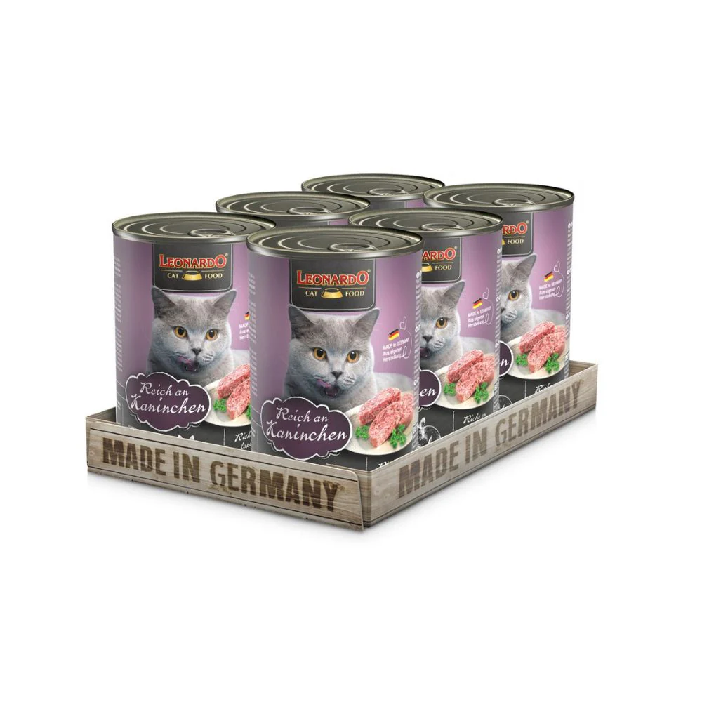 Quality Selection Conejo de LEONARDO® Es carne de alta calidad en lata, es ideal para una alimentación BARF*. Los gatos, al igual que los felinos que viven en el medio natural, son carnívoros. Este es el por qué solamente se utilizan productos cárnicos frescos. Gracias a la alta disponibilidad biológica y a la alta calidad de estos productos, su gato necesita una cantidad relativamente pequeña para satisfacer sus necesidades nutricionales diarias