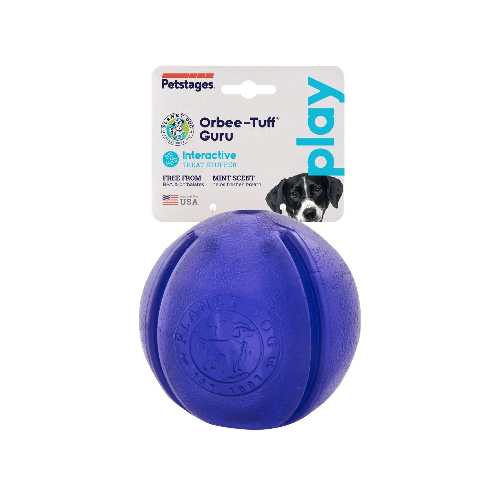 Planet Dog Guru Purpura es un juguete interactivo ultrarresistente presenta cinco aberturas diferentes para esconder golosinas. Una vez que las golosinas estén escondidas, su mascota tendrá que esforzarse para liberarlas. Este juguete está diseñado para que las golosinas salgan solo cuando el perro ha aplicado suficiente presión. Todos sus productos están orientados al enriquecimiento de ambiente. Aquellos elaborados con su material patentado OrbeeTuff, son resistentes, ligeros, flotables y con olor a menta.