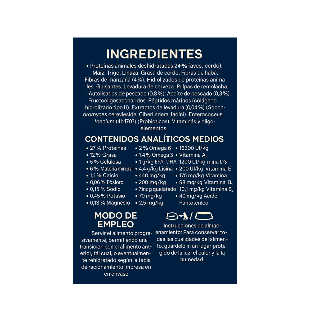 Con antioxidantes naturales, taurina y prebióticos, esta fórmula ayuda a combatir los radicales libres, proteger la función cardíaca y mejorar la digestión. La croqueta pequeña facilita la masticación y contribuye a la limpieza dental natural, ideal para perros con mandíbulas delicadas.