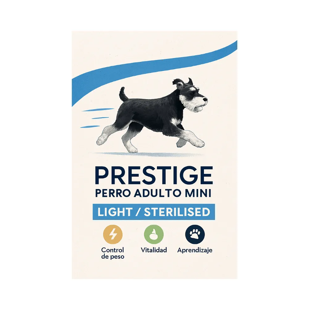 Prestige Adult Mini Light Sterilized 3Kges un alimento super premium formulado para perros adultos de raza pequeña que han sido esterilizados o presentan tendencia al sobrepeso. Su receta hipocalórica, rica en fibras vegetales y proteínas funcionales, ayuda a mantener un peso saludable sin comprometer la masa muscular ni la vitalidad.