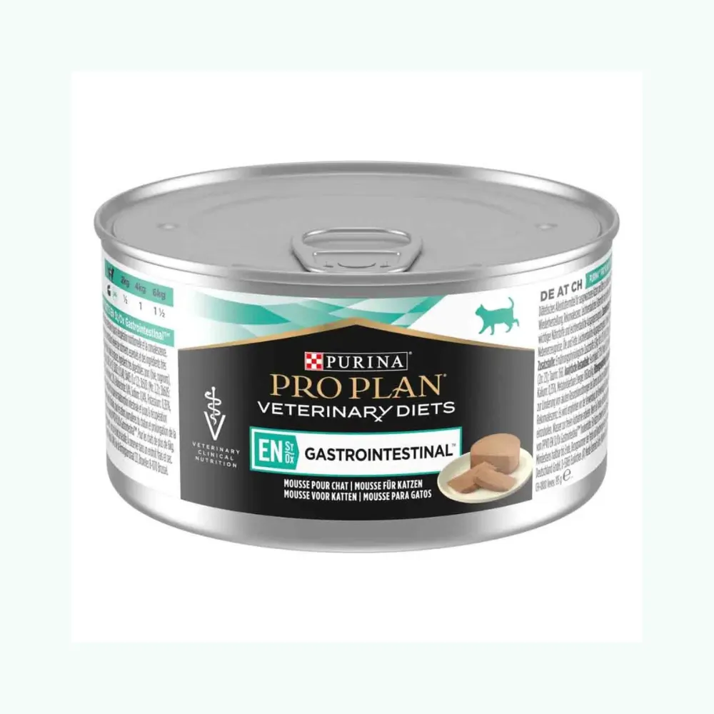 Pro Plan Veterinary Diets EN Gastroenteric Gato Lata 156 Gres un alimento húmedo de prescripción veterinaria formulado para gatos con trastornos digestivos. Su alta digestibilidad y perfil nutricional especial ayudan a mejorar la absorción de nutrientes, favorecen la recuperación y mantienen la salud gastrointestinal.