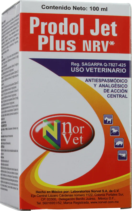 PRODOL-JET NRV es un analgésico desinflamatorio y antipirético recomendado para el tratamiento sintomático de enfermedades que cursen con dolor y fiebre como: cólicos, traumatismos, espasmos musculares, inflamaciones, molestias postoperatorias o posparto. En bovinos, equinos, ovinos, caprinos, porcinos, caninos y felinos.