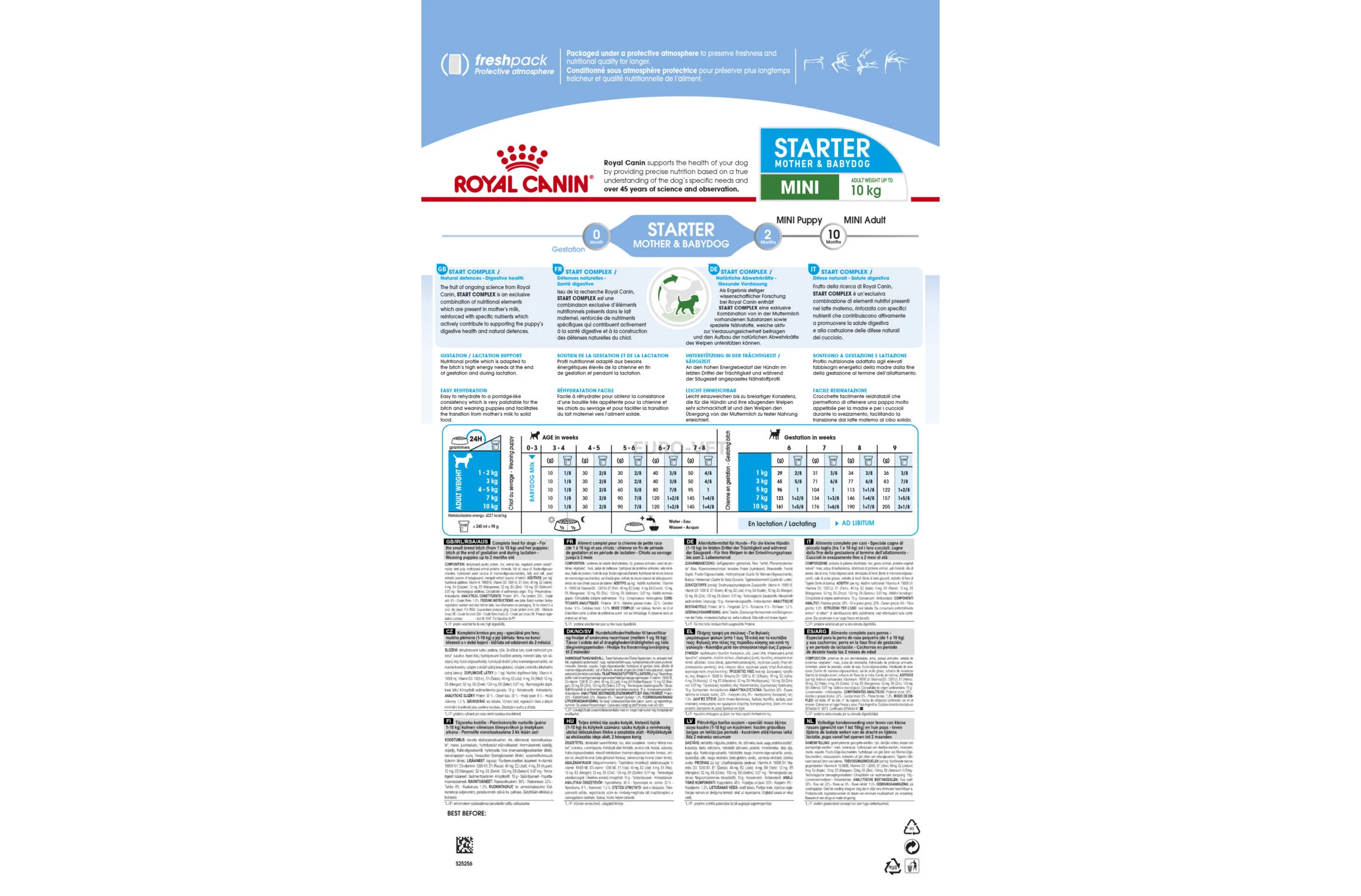 El programa de crecimiento de Royal Canin Mini Starter Mother and Baby Dog es una solución nutricional única que satisface las necesidades de la madre y sus cachorros en cinco etapas del ciclo de la vida: gestación, nacimiento, lactancia, destete y crecimiento hasta los 2 meses de edad. Royal Canin Starter utiliza una combinación nutricional exclusiva, con elementos presentes en la leche materna, reforzada con nutrientes específicos que contribuyen y promueven la seguridad digestiva y refuerzan las defensas naturales de los cachorros.