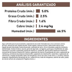 Agua suficiente para el procesamiento, carne de pollo, subproductos de cerdo (menudencias), sémola de maíz, arroz cervecero, harina de maíz, aceite vegetal, celulosa en polvo, fosfato tricálcico, gluten de trigo, cloruro de potasio, saborizante natural (ave), carragenina, aceite de pescado, carbonato de calcio, pulpa de remolacha deshidratada, taurina, goma guar, goma de algarrobo, fosfato de potasio, tripolifosfato de sodio, cloruro de colina, oligoelementos (proteinato de zinc, sulfato ferroso, óxido manganoso, yodato de calcio, selenito de sodio), L-carnitina, vitaminas [acetato de DL-alfa tocoferol (fuente de vitamina E), L-ascorbil-2-polifosfato (fuente de vitamina C), mononitrato de tiamina (vitamina B1), biotina, suplemento de niacina, D-pantotenato de calcio, suplemento de riboflavina (vitamina B2), clorhidrato de piridoxina (vitamina B6), suplemento de vitamina B12, ácido fólico, vitamina K3, suplemento de vitamina D3], óxido de magnesio.