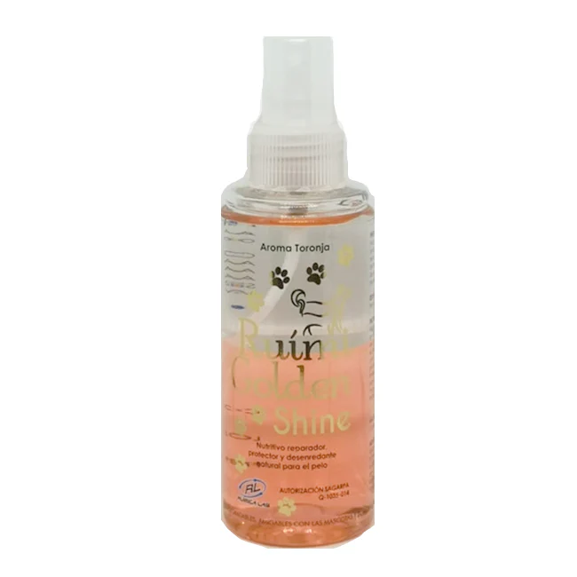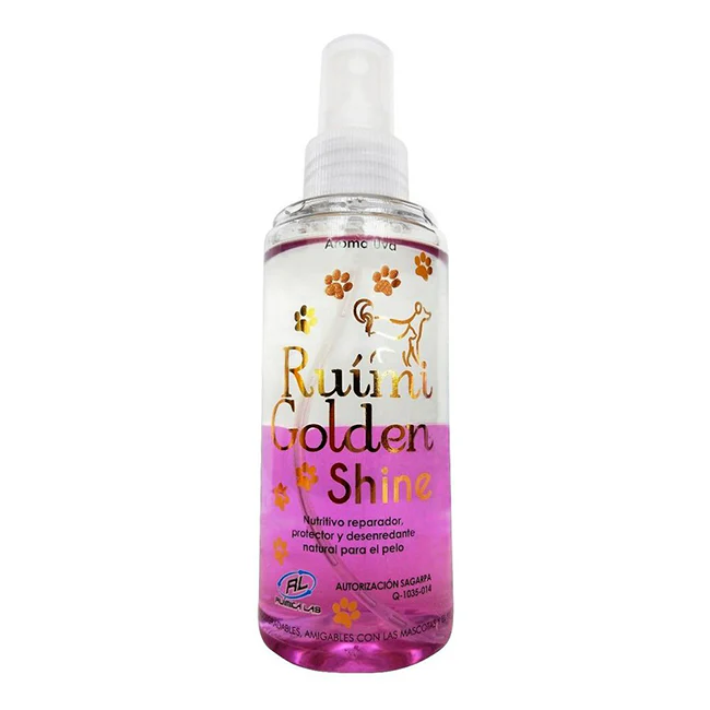 ruimi golden shine es un spray que ayuda a desenredar nudos en el pelo de tu mascota. gracias a sus ingredientes de aceite de aceite de argán, aceite de uva y aceite de oliva, el pelaje de tu mascota lucirá hidratado, suave y brillante. regula la secreción sebácea de la piel y el cuero cabelludo. no escatimes en la salud de tu mascota, frida pets te recomienda los mejores productos con la más alta calidad.