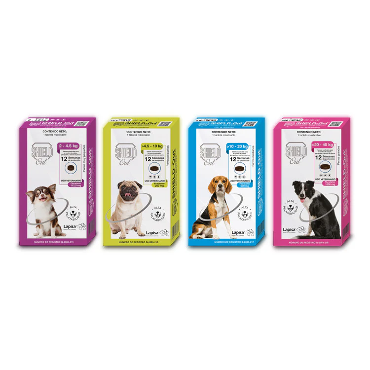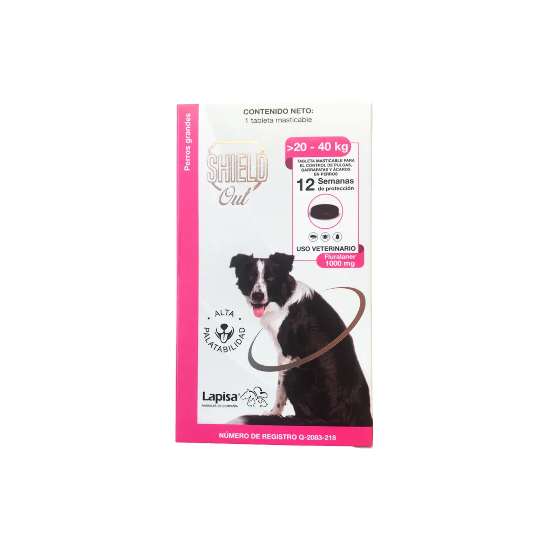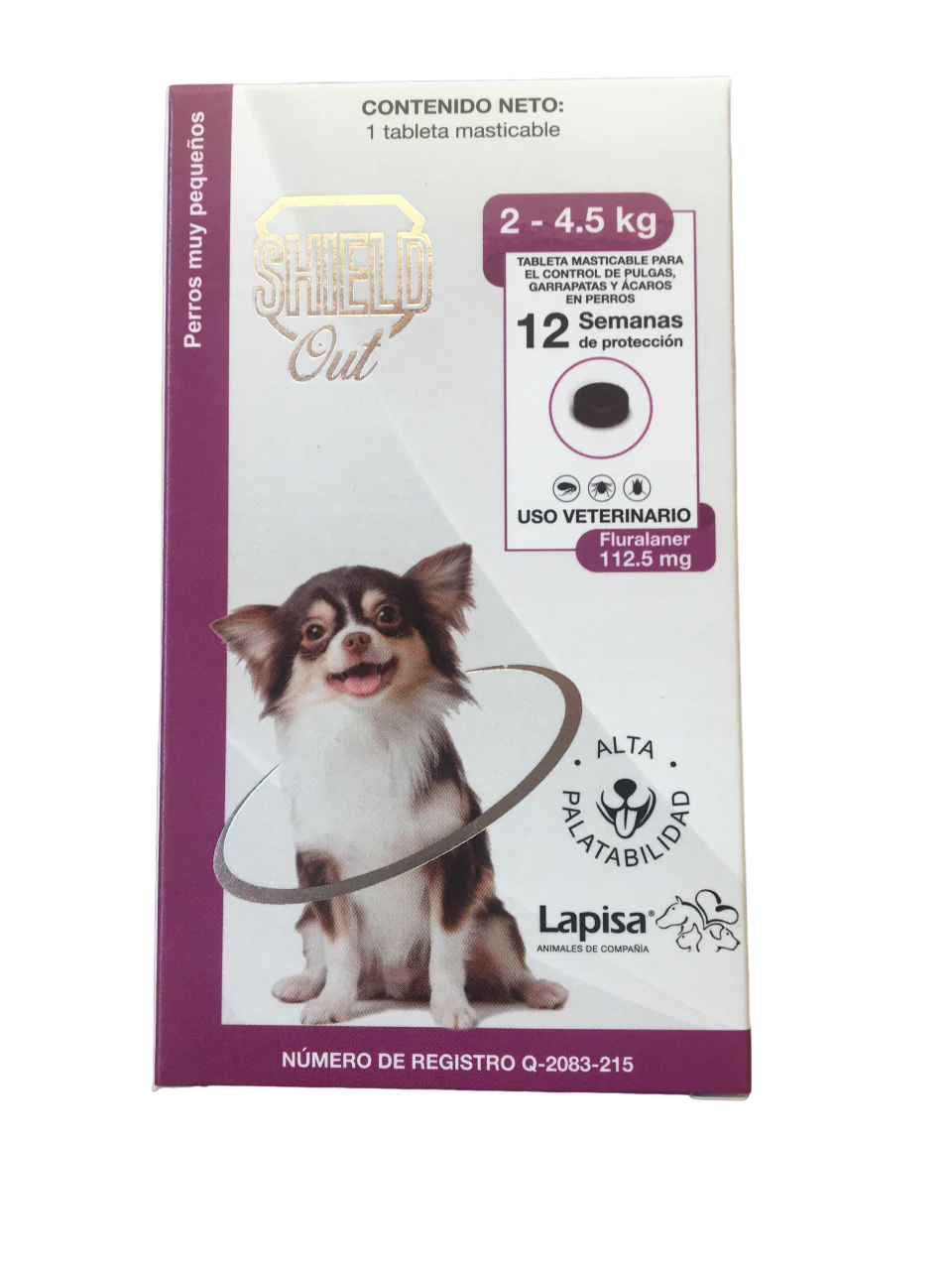 Acaricida e insecticida sistémico. Shield-Out es un acaricida e insecticida sistémico de acción inmediata indicado para controlar las infestaciones por ectoparásitos (garrapatas y pulgas) en perros por un periodo de 12 semanas. Es efectivo contra la garrapata Rhipicephalus sanguineus (larvas, ninfas y adultas) y pulgas (Ctenocephalides canis). Shield-Out está recomendado para el tratamiento de la demodicosis causada por Demodex spp., en perros.
