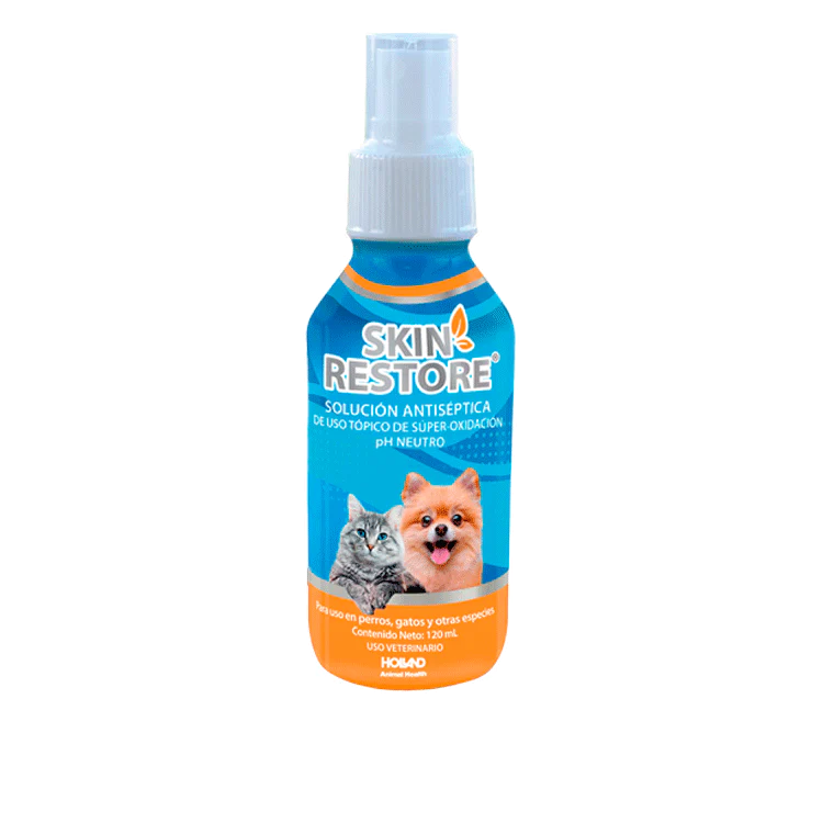 Lavar la zona afectada con agua y jabón, aplicar Skin-Restore® directamente sin diluir cubriendo la piel o mucosa a tratar en su totalidad. Repetir la aplicación tres veces al día o como lo indique el Médico Veterinario.